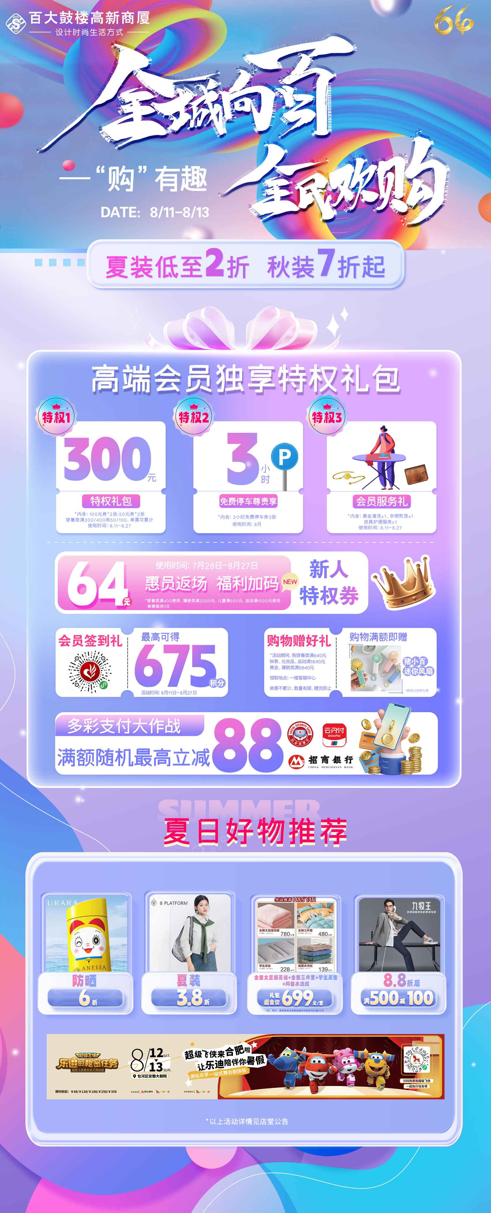 1.夏装出清低至2折,秋装新品7折起;2.新人特权券,通过智慧导购派券;3.高端会员独享特权礼包;4.品牌会员礼;5.会员签到礼;6.欢乐64,购物赠好礼