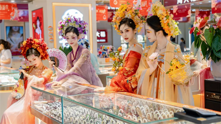 周末,一场国风达人簪花巡游活动在肥西百大举行,青春美丽的簪花姑娘们身着汉服,头簪多彩花卉优雅登场,将浩繁古卷中的唐韵花文化一一呈现,仿佛一座座行走的花园。