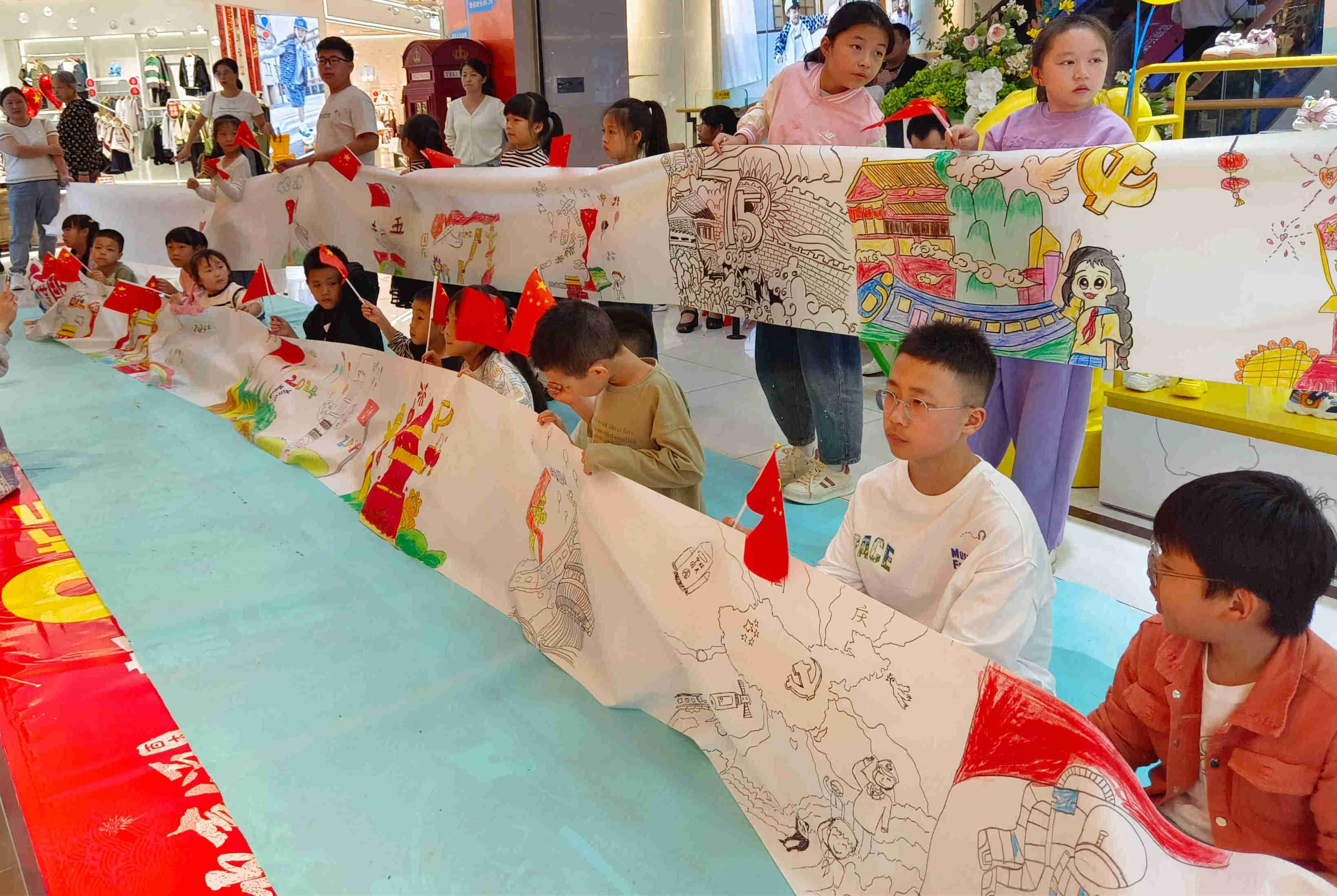 为弘扬爱国主义精神,厚植爱党爱国情怀,表达对祖国的诚挚祝福,同时激发孩子们感受美、表现美、创造美的情感,体验自由表达和创作的快乐,10月1日国庆节当天,铜陵百大的六楼童装区开展“百米画卷绘祖国”主题活动。
