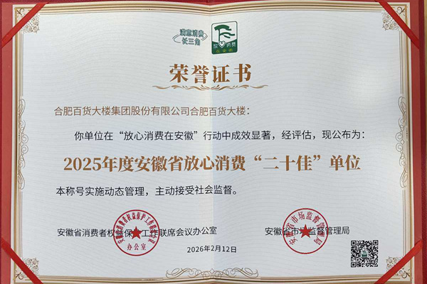 近日,安徽省消费者权益保护工作联席会议办公室联合省市场监督管理局公布了2025年度安徽省放心消费“二十佳”及优秀单位名单。合肥百货大楼凭借在诚信经营、消费维权、品质保障等方面的卓越表现,从全省众多参评单位中脱颖而出,荣膺 “2025年度安徽省放心消费‘二十佳’单位”称号。这一荣誉不仅是对这座“中华老字号”百货大楼六十七载匠心坚守的权威认可,更是对其在新时代持续引领消费信心、优化服务体验的生动诠释。