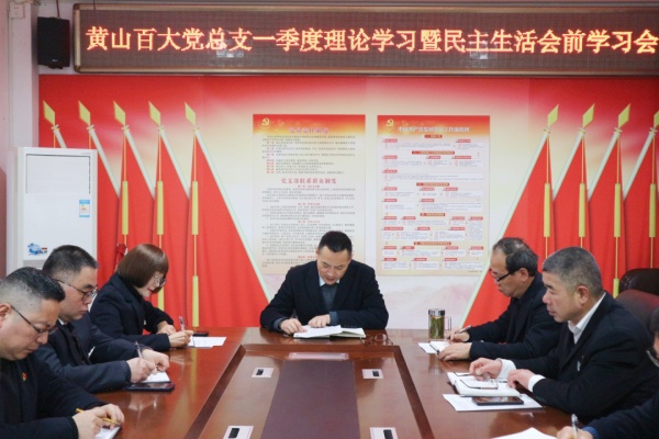 2026年2月3日下午,黄山百大党总支召开一季度理论学习暨2025年度民主生活会前专题学习会议。公司党总支书记、董事长王超玮主持会议,领导班子成员、各部门负责人参加学习。