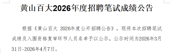 3/31/2026黄山百大2026年度招聘笔试成绩公告