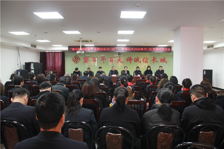 策马扬鞭战首季,奋蹄夺彩开门红。蚌埠百大全体职工将以此次动员大会为新的起点,以更加饱满的热情、更加扎实的作风、更加有力的举措,全身心投入到“开门红”竞赛热潮中去,为全面完成竞赛目标任务、为实现公司2026年高质量发展“开门红”“全年红”而努力奋斗。