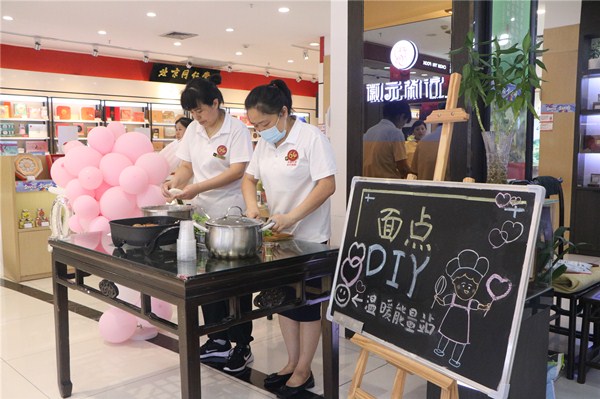 不思路远,不念时长。在七夕这个特殊的日子里,百大CBD一楼商场“温暖能量站”为了拉近与客户之间的情感开展了一场别有情趣的“面点 DIY”活动,商场经理助理温玉屏带领滋补烟酒区员工现场制作肉夹馍面点美食,免费送给顾客品尝,展现商场浓郁的文化氛围。