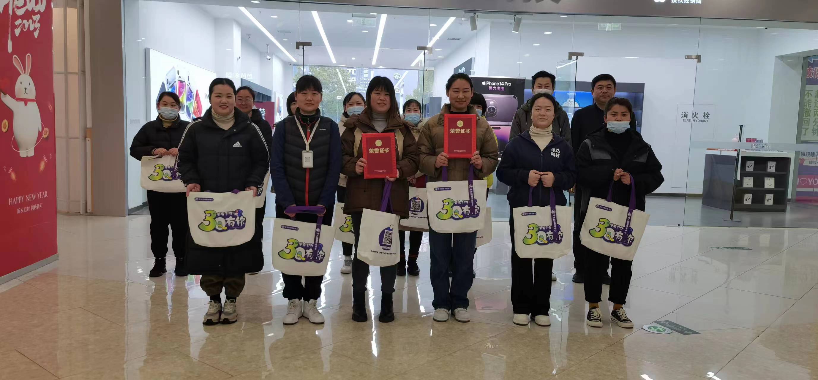 2023年2月6日上午固镇百大购物中心举办2023年开门红劳动竞赛(2022.12.29—2023.1.27)表彰活动。固镇店营运部部长助理朱楠楠在商场一楼中庭主持表彰活动,春节刚过,根据劳动竞赛期间各品牌制定的销售任务评选,“露韵诗”女装、“华为”手机、“普菲亚”男装取得了销售前三甲。