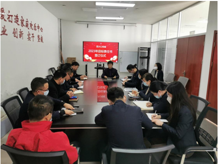 2023年1月16日下午,百大心悦城2023年目标责任书签订仪式在心悦城六楼会议室举行。会议由综合部负责人张亚瑶主持,心悦城领导班子成员及各部门负责人参加此次会议。