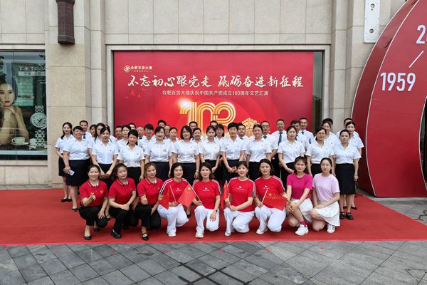 为热烈庆祝中国共产党成立103周年,回顾党的光辉历程,讴歌党的丰功伟绩。7月1日早上,合肥百货大楼在门前广场开展了以“不忘初心跟党走,砥砺奋进新征程”为主题的文艺汇演活动。公司全体党员及青年团员、部分职工代表百余人参加了此次活动。