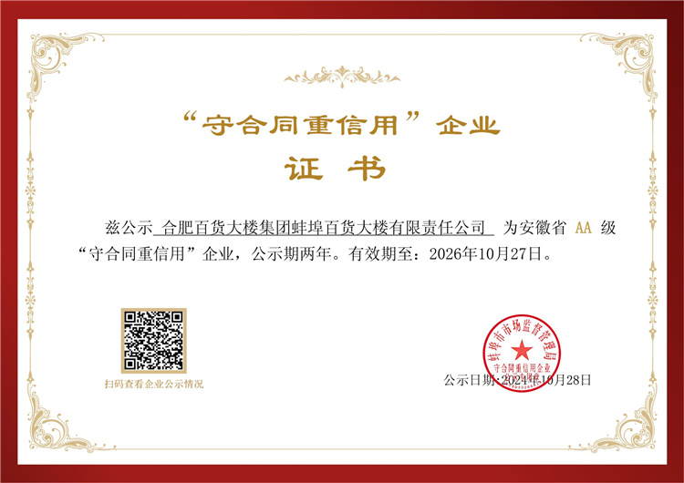近日,经安徽省市场监督管理局审核通过,百大集团蚌埠百货大楼、蚌百名品中心双双获评安徽省AA级“守合同重信用”企业荣誉称号。