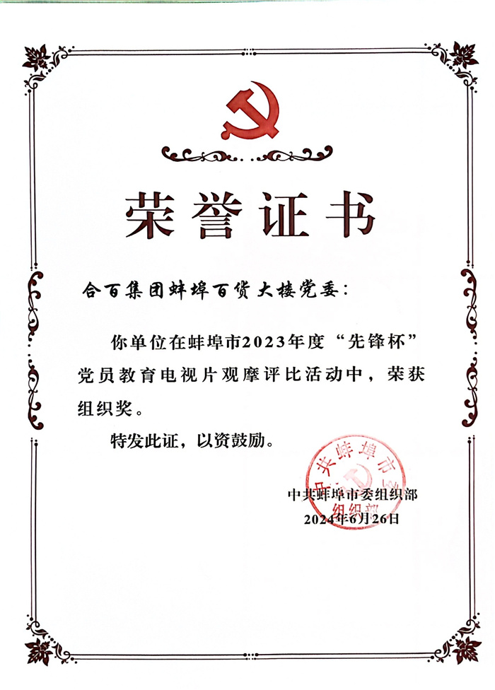 近日,市委组织部组织开展的蚌埠市“先锋杯”党员教育电视片观摩评比活动评选结果公布,在众多参赛作品中,蚌埠百大党委荣获“组织奖单位”,报送的作品《坚“手”底线》荣获优秀奖。
