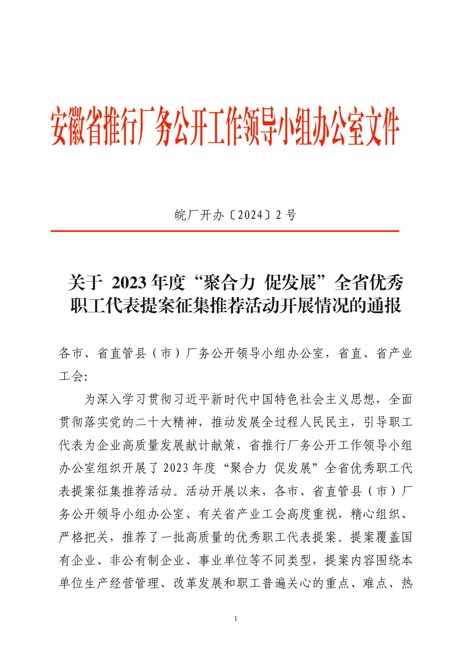 近日,省厂开办通报了2023年度“聚合力 促发展”全省优秀职工代表提案征集推荐活动开展情况,蚌埠百大提出的《关于建立员工特殊情况“五必访”制度的提案》获全省优秀职工代表提案。