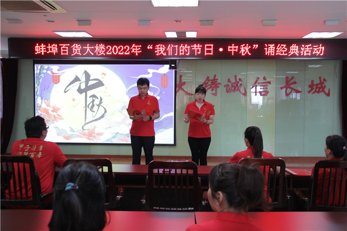 为喜迎中秋佳节,大力弘扬中华民族优秀文化传统,营造浓厚的节日氛围,9月6日上午,蚌埠百大组织开展“我们的节日·中秋”诵经典活动。