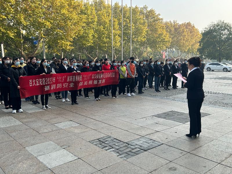 为全面落实消防安全主体责任,确保百大宝龙店消防安全形势持续稳定。11月8日上午8点50分,百大宝龙店在北门广场举行“抓消防安全,保高质量发展”2022年“11.9”消防宣传月暨“11.17”百大安全警示日活动动员大会,公司全体员工参加了本次活动。