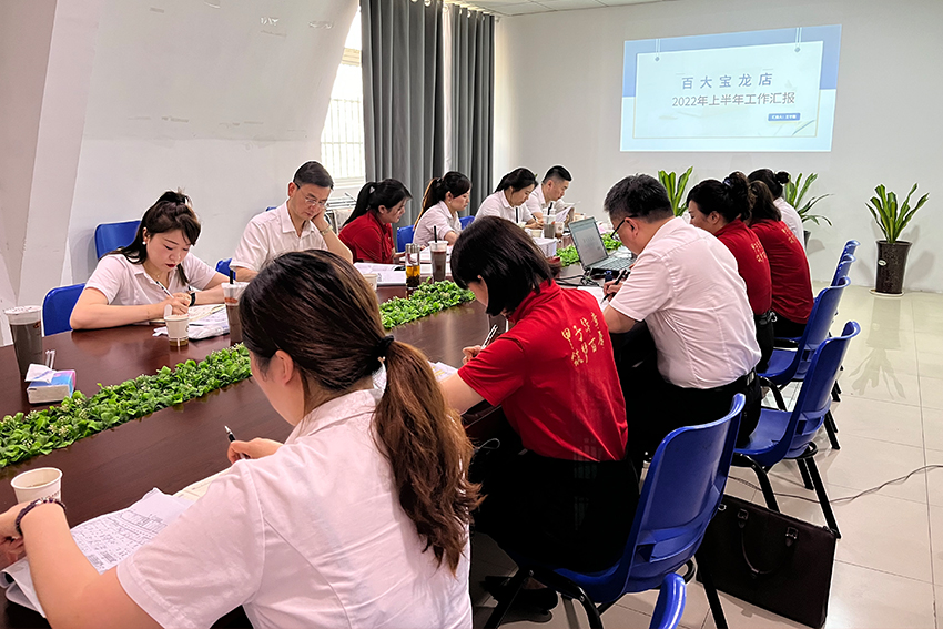 2022年6月29日,集团副总经理张同祥一行莅临百大宝龙店开展采购督导工作,蚌埠百大党委书记、董事长郭宏组织商场管理团队召开交流座谈会议。