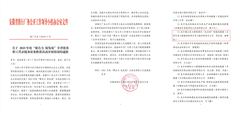 近日,省厂开办通报了2023年度“聚合力 促发展”全省优秀职工代表提案征集推荐活动开展情况,蚌埠百大提出的《关于建立员工特殊情况“五必访”制度的提案》获全省优秀职工代表提案。
