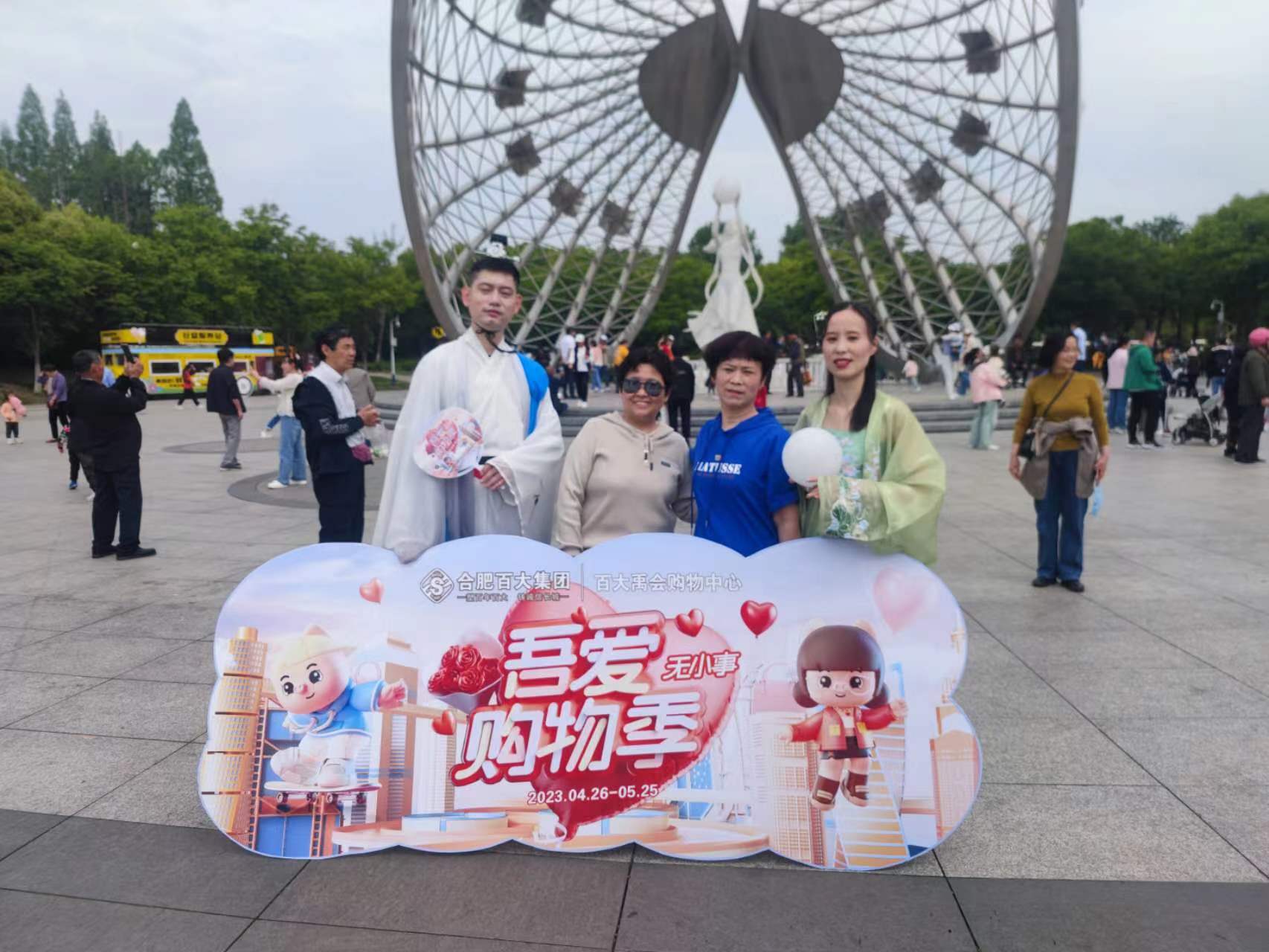 热闹的张公山公园,目之所及皆有花开。百大禹会购物中心在合百集团吾爱购物季开启之际,商场员工身穿职业装,画上美美的妆容,和“冥夜”与“桑酒”一起,来到张公山珍珠女旁,打卡推广吾爱购物季。