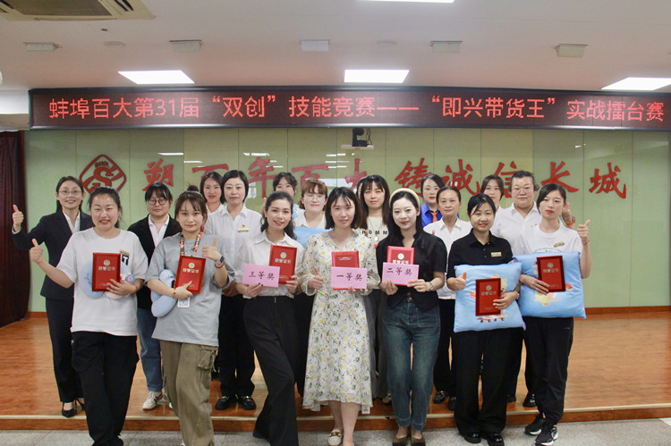 为营造双创竞赛氛围,提升员工商品推介与销售实战能力,挖掘直播人才潜力,培养带货技能,4月24日,蚌埠百大组织开展“即兴带货王”实战擂台赛,蚌百四店员工代表参赛,公司党委委员、工会主席邵东侠主持活动。