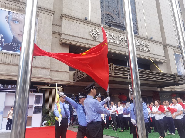 为热烈庆祝中华人民共和国成立75周年,进一步激发全体员工爱国主义热情。2024年10月1日上午,鼓楼、CBD举行了国庆升国旗仪式,仪式在鼓楼金座门前广场举行,两店领导班子成员及80余名党员职工参加了此次活动,共同祝福伟大祖国繁荣昌盛、人民幸福安康。