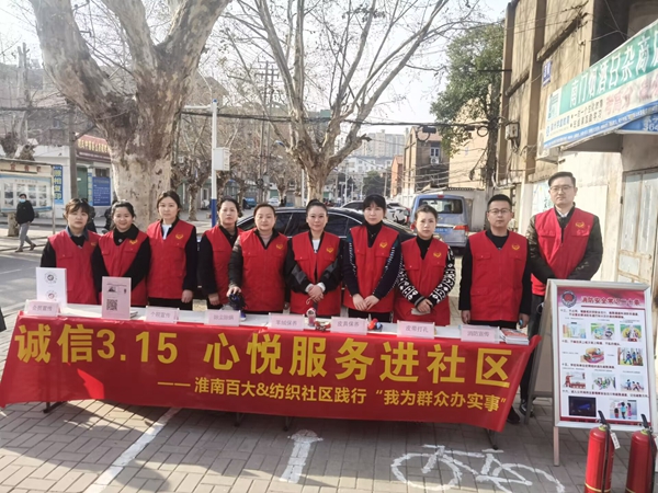 为进一步推进“心悦服务”品牌建设,做好文明创建结对共建工作。淮南百大于3月15日在纺织社区、公司北门开展“诚信3·15心悦服务” 活动。