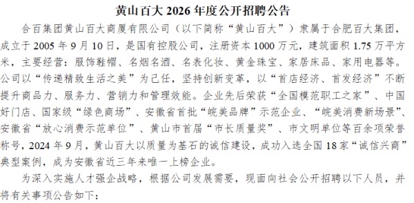 合百集团黄山百大商厦有限公司(以下简称“黄山百大”)隶属于合肥百大集团,成立于2005年9月10日,是国有控股公司,注册资本1000万元,建筑面积1.75万平方米,主要经营:服饰鞋帽、名烟名酒、名表化妆、黄金珠宝、家居床品、家用电器等。公司以“传递精致生活之美”为己任,坚持创新变革,以“首店经济、首发经济”不断提升商品力、服务力、营销力和管理效能。企业先后荣获“全国模范职工之家”、中国好门店、国家级“绿色商场”、安徽省首批“皖美品牌”示范企业、“皖美消费新场景”、安徽省“放心消费示范单位”、黄山市首届“市长质量奖”、市文明单位等百余项荣誉称号,2024年9月,黄山百大以质量为基石的诚信建设,成功入选全国18家“诚信兴商”典型案例,成为安徽省近三年来唯一上榜企业。