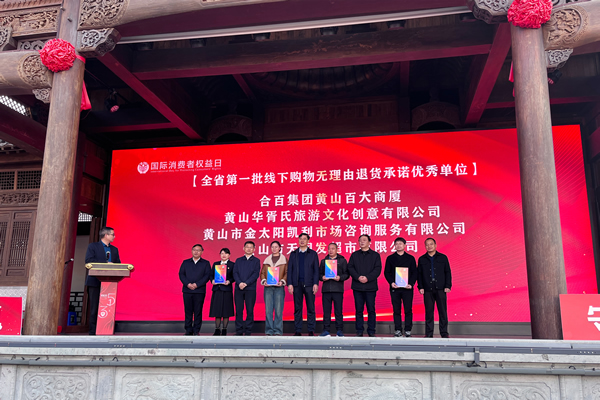 2024年3月15日上午,黄山市2024年纪念“3·15”国际消费者权益日活动仪式隆重举行。仪式上,黄山百大荣获安徽省“优秀线下无理由退货承诺单位”称号,这是黄山百大诚信建设继安徽省“皖美品牌示范企业”、安徽省“放心消费示范单位”、安徽省“诚信单位”等荣誉称号后,获得的又一项省级殊荣。