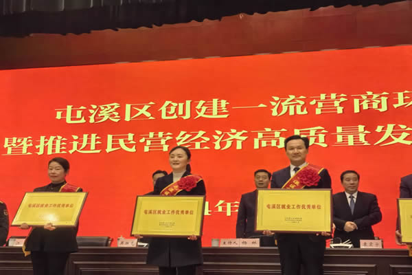 2月24日上午,屯溪区“创建一流营商环境暨推进民营经济高质量发展大会”在区委区政府礼堂隆重举行,黄山百大在大会上被授予“屯溪区就业工作优秀单位”荣誉,黄山百大党总支书记、董事长、总经理沈萍代表企业领取荣誉,并作为区就业工作优秀单位代表作交流发言。