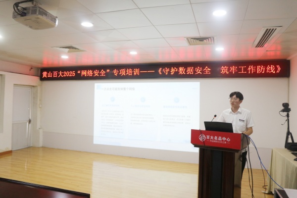 随着计算机网络技术的不断发展,加快了信息化的脚步,同时网络安全问题也日渐突出。为积极响应国家网络安全宣传周活动,黄山百大于2025年9月26日下午开展了主题为“守护数据安全,筑牢工作防线”的网络安全培训,公司管理人员及新青年参加了本次培训。