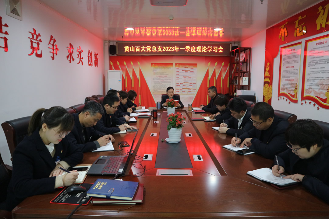 3月9日上午,黄山百大党总支2023年第一季度理论学习会在公司七楼会议室召开。公司党总支班子、各部门负责人参加学习。