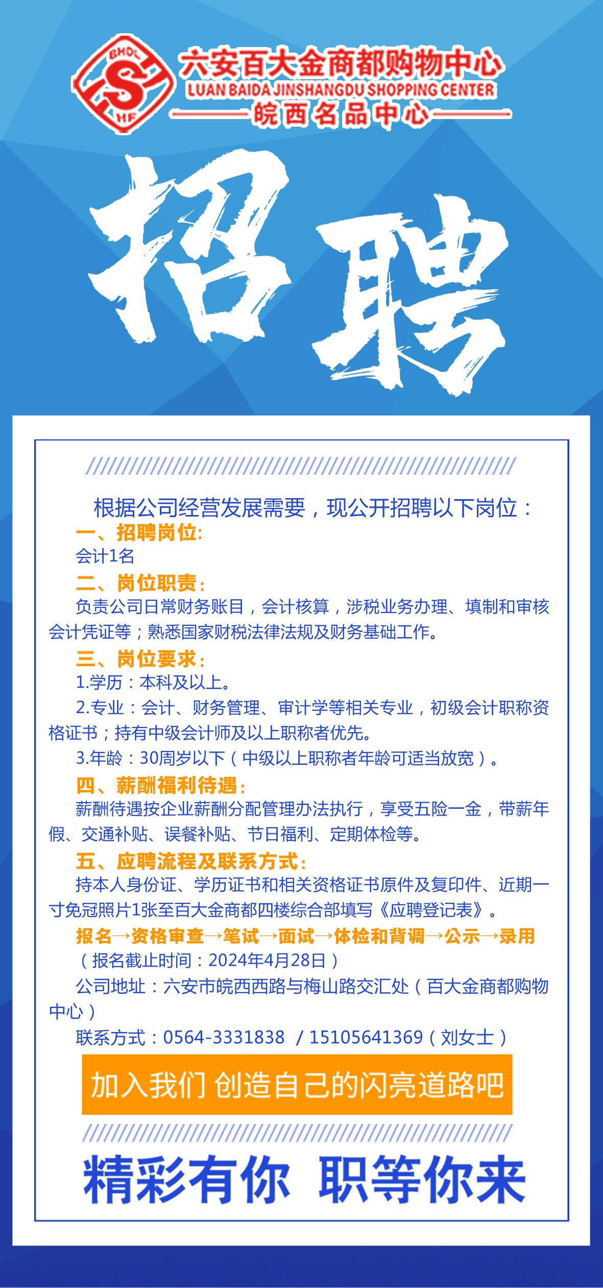 六安百大招聘启事 根据公司经营发展需要,现公开招聘以下岗位:一、招聘岗位及人数: 会计1名