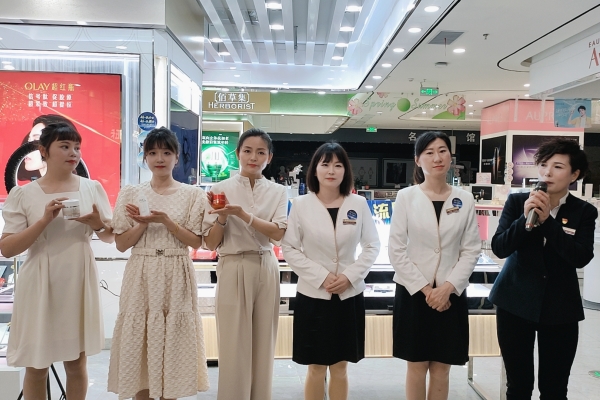 5月11日,百大商业大厦推出玉兰油优秀品牌销售经验分享主题晨会。晨会上,玉兰油店长赵蕾分别从品牌文化、现场皮肤测试、VIP客户管理、线上直播带货技巧四个方面做了分享。
