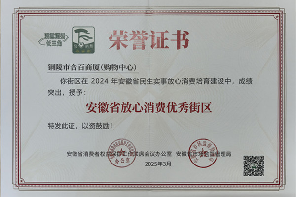 近日,安徽省消费者权益保护工作联席会议办公室、安徽省市场监督管理局公布2024年度放心消费认定名单,铜陵百大购物中心喜获“2024年度安徽省放心消费优秀街区”荣誉称号。 铜陵百大发挥国企担当,在省、市市监局指导下,联动百货、家电、超市等150余家商户,对照《放心消费街区培育评价标准指引(2024版)》推进创建工作,构建多方协同的消费环境治理格局。
